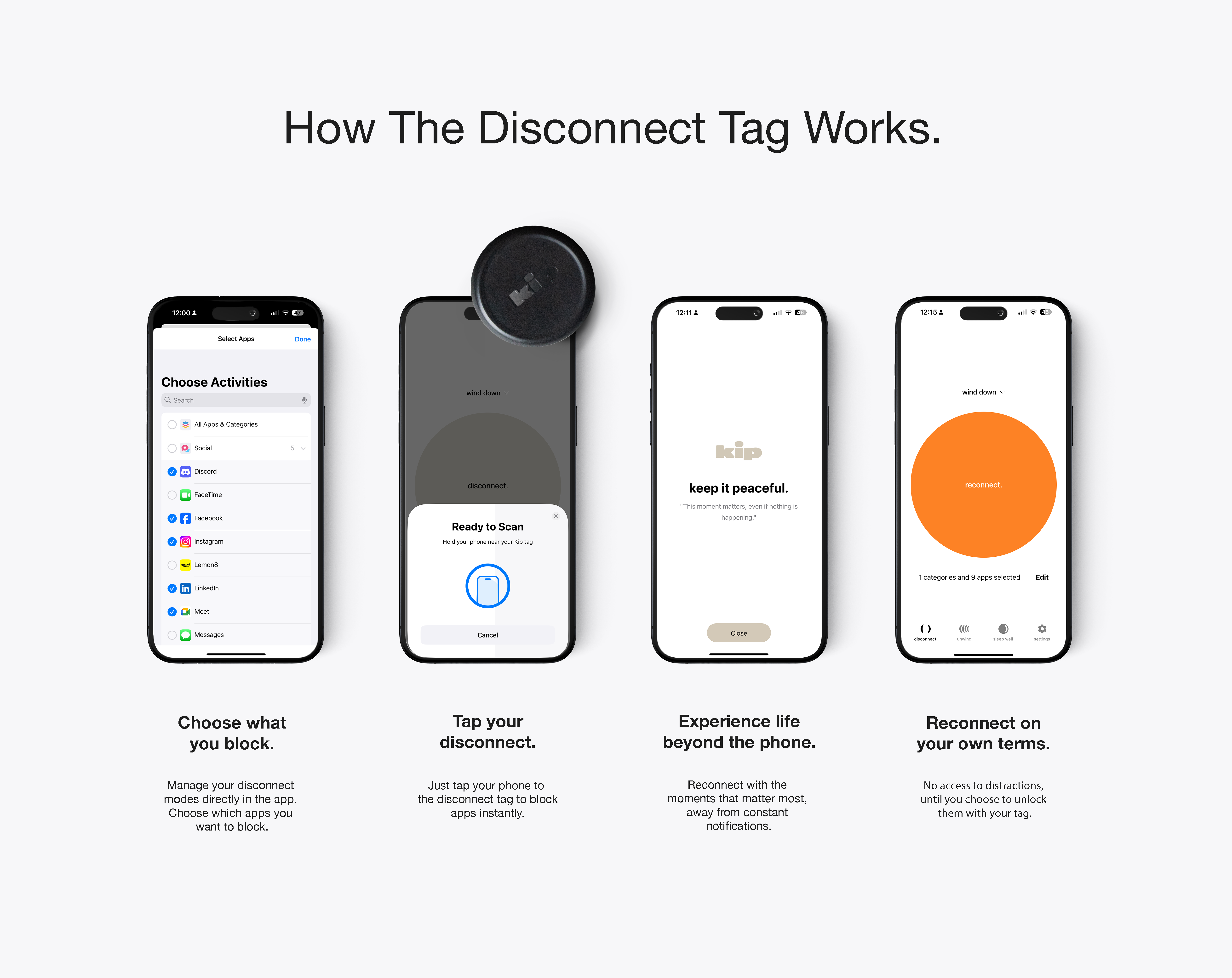 When you tap your phone to the tag, it activates a mode in the kip app that blocks the apps you choose. Socials, news, messages… or anything else you need a break from.